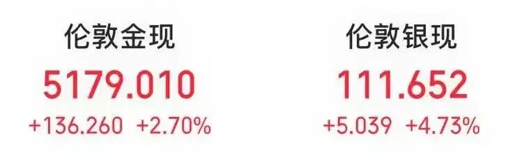 截至今晨收盘,伦敦金现货价格上涨2.7%,报5179美元/盎司,再创历史新高;纽约期金价格上涨1.88%,突破5200美元/盎司;伦敦银现货价格上涨4.73%,纽约期银价格下跌2.73%;NYMEX钯主力合约跌逾10%,NYMEX铂主力合约跌逾8%。