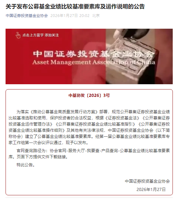 1月27日,中国基金业协会发布公募基金业绩比较基准要素库(以下简称基准库)及运作说明的公告,基准库包括《公募基金业绩比较基准要素库运作说明》和股票指数一类库、二类库,重点规范股票指数选取,分层设置基准库。沪深300指数、中证A500指数等纳入一类库,上证180指数、中证2000指数等纳入二类库。