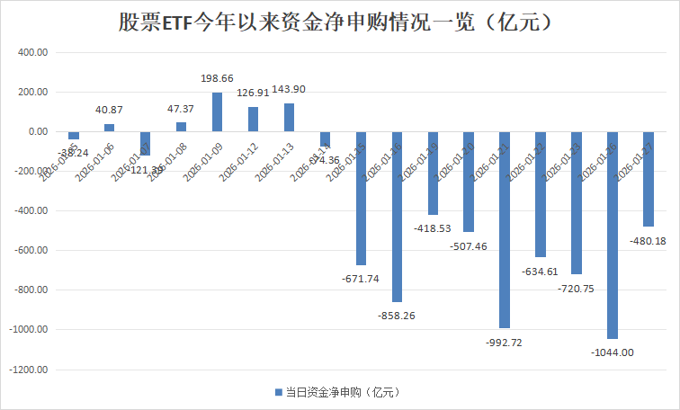 据银河证券基金研究中心数据统计,1月27日,全市场股票ETF(含跨境ETF)资金净流出超480亿元,这也是今年以来,股票ETF连续第十个交易日出现资金净流出,最近十个交易日合计净流出金额超6400亿元。
