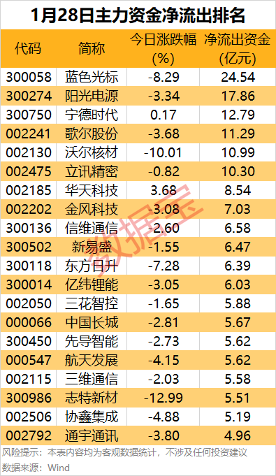 此外,还有宁德时代、歌尔股份、沃尔核材、立讯精密、华天科技和金风科技等热门股主力资金净流出金额居前;其中,沃尔核材今日跌停。