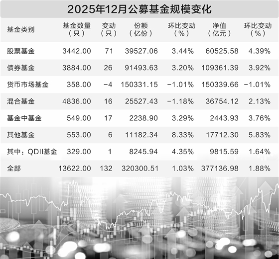 分基金类型来看,2025年12月份,股基、债基以及货币基金规模和QDII基金均有不同程度的增长。