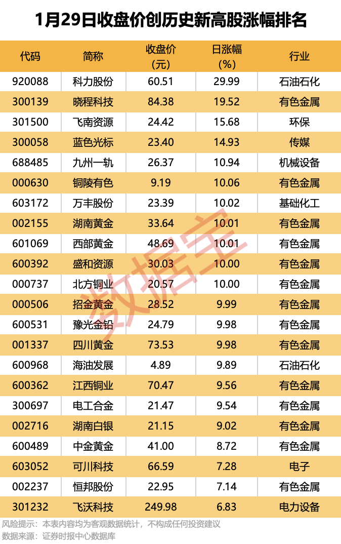 收盘价创历史新高股中,今日股价平均上涨6.38%,涨停的有科力股份、铜陵有色、万丰股份等,涨幅居前的有晓程科技、飞南资源、蓝色光标等。