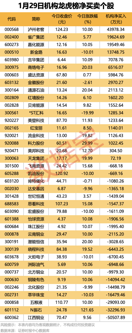 机构净卖出个股中,江西铜业遭机构净卖出5.05亿元,居首;紧随其后是N振石、五粮液和萃华珠宝,净卖出金额均超1.6亿元。