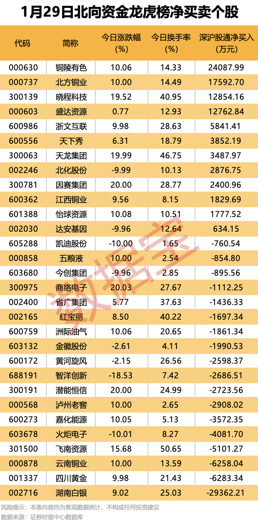 今日龙虎榜现身个股中,12股获北向资金净买入。净买入居首的是铜陵有色,金额为2.41亿元;北方铜业、晓程科技、盛达资源均获净买入超1.2亿元。