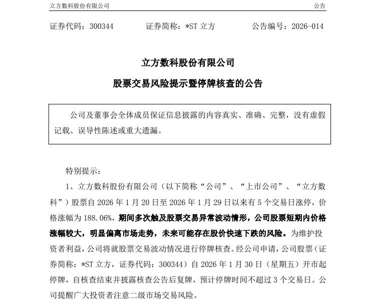 盘面数据显示,*ST立方股票自1月20日至1月29日期间,有5个交易日实现涨停,累计价格涨幅达188.06%,其间多次触及股票交易异常波动情形。公司在公告中提示,股票短期内价格涨幅较大,明显偏离市场走势,未来可能存在股价快速下跌的风险,此次停牌核查的目的是核查股价异常波动背后是否存在未披露的重大信息、市场传闻是否属实等相关情况,确保信息披露的真实性、准确性和完整性,切实保护投资者合法权益。