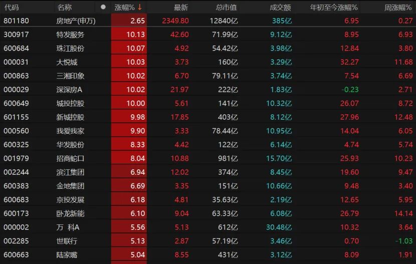 珠江股份、大悦城、三湘印象等7只房地产股涨停。