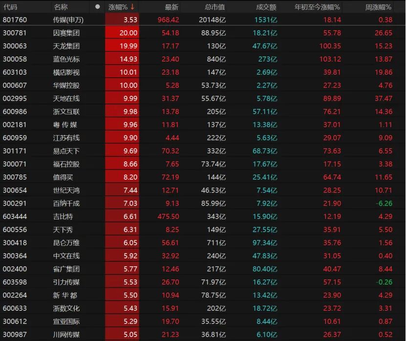 8只传媒股涨停,因赛集团、天龙集团“20cm”涨停,蓝色光标涨近15%。横店影视、华媒控股、天地在线、浙文互联、粤传媒、江苏有线涨停。