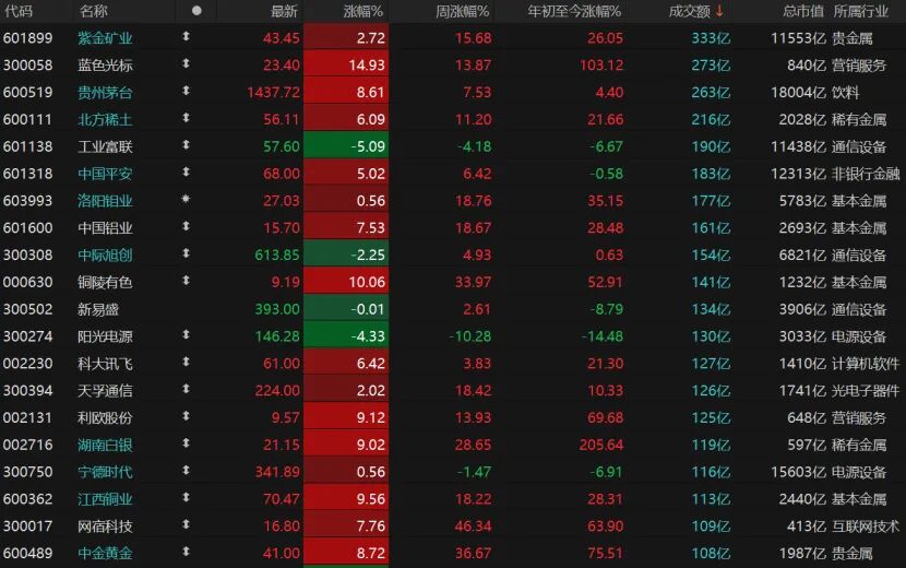 25只个股日成交额不低于100亿元,紫金矿业日成交额依旧排第一,增至333亿元;贵州茅台日成交额为263亿元;北方稀土涨逾6%。工业富联跌逾5%,中际旭创跌逾2%,阳光电源跌逾4%。