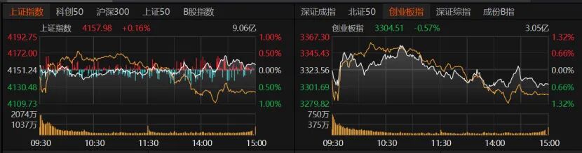 受板块分化影响,指数涨跌不一。沪指收涨0.16%报4157.98点,创业板指收跌0.57%报3304.51点。科创50跌逾3%,北证50收跌1.69%。沪深300、上证50均收红。