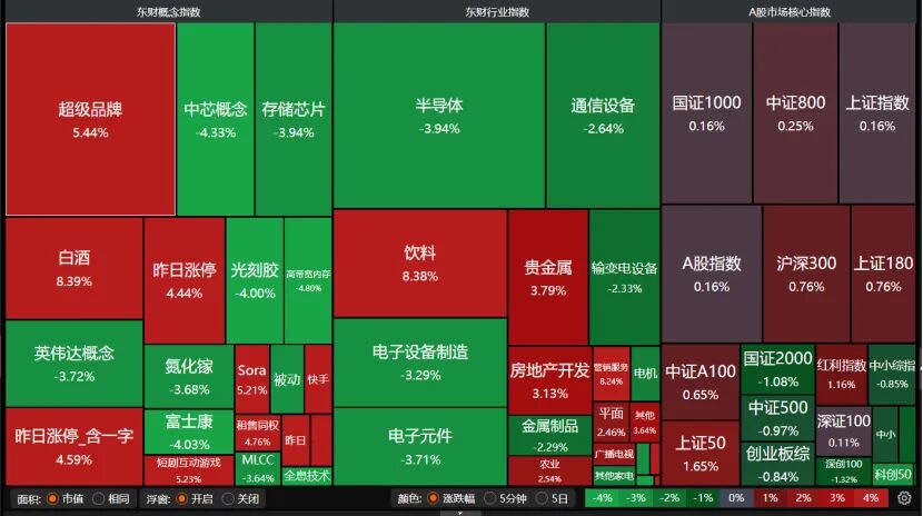 盘面上,超级品牌、白酒、饮料、房地产大爆发,贵金属、营销服务、农业也表现不错。半导体、英伟达概念、通信设备、存储芯片、输变电设备等科技板块熄火。