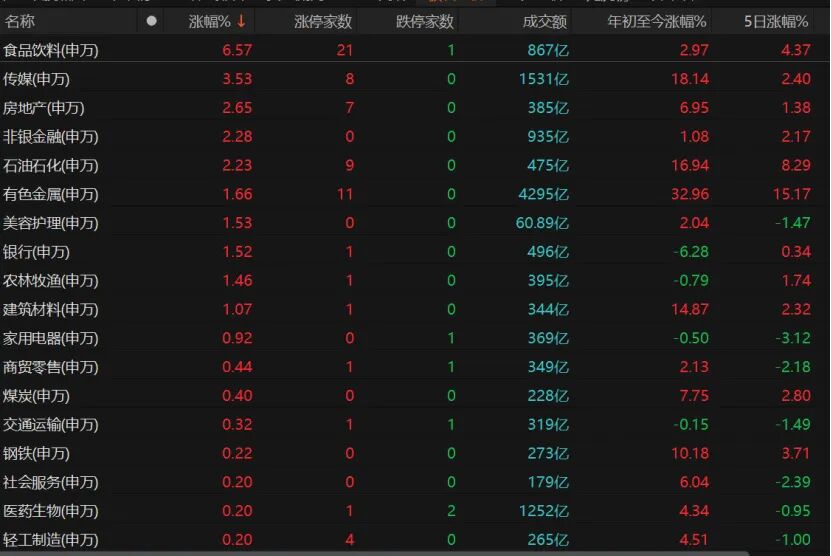 从具体流向来看,主力资金全天净流入传媒、食品饮料、房地产等板块,而半导体、有色金属、家用电器等板块则遭遇资金净流出。毕梦姌指出,这一调仓路径清晰表明,资金正从前期涨幅较大的热门赛道,向政策驱动、确定性更强的防御型板块转移,本质上是节前避险情绪的体现,并非趋势性撤离。