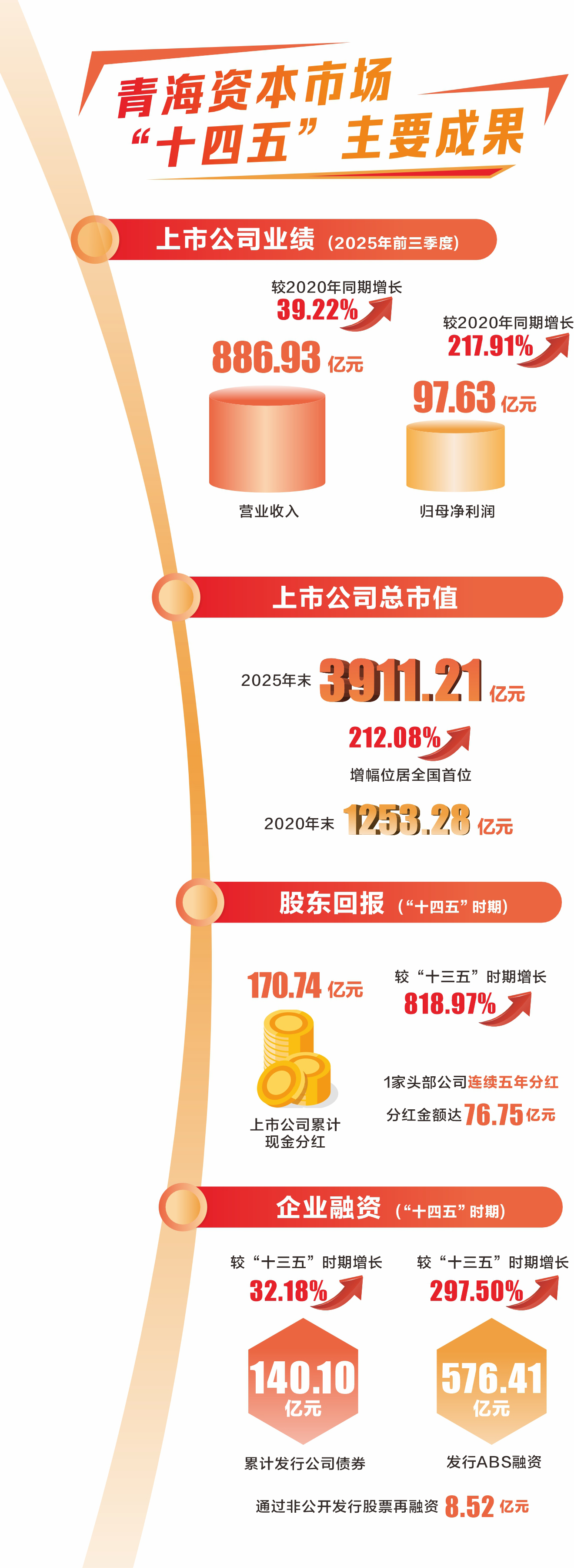 “十四五”时期,青海上市公司实现质量和市值“双跃升”。2025年前三季度,青海上市公司收入总额886.93亿元,较2020年同期增长39.22%;实现归母净利润97.63亿元,较2020年同期增加217.91%。上市公司总市值从2020年末的1253.28亿元,增长到2025年末的3911.21亿元,增长212.08%,增长率位居全国首位。