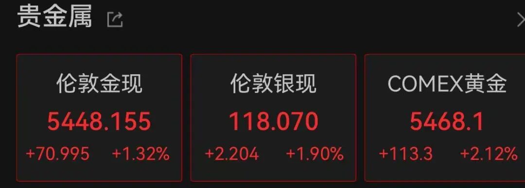 今日早盘,黄金与白银再度稳定走高,截至发稿,黄金涨至5400美元上方,白银则涨至118美元附近。