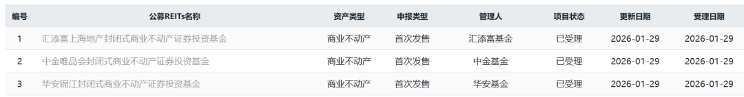 1月29日,首批3家商业不动产REITs已申报,且已被上交所受理,预计募资131.75亿元。
