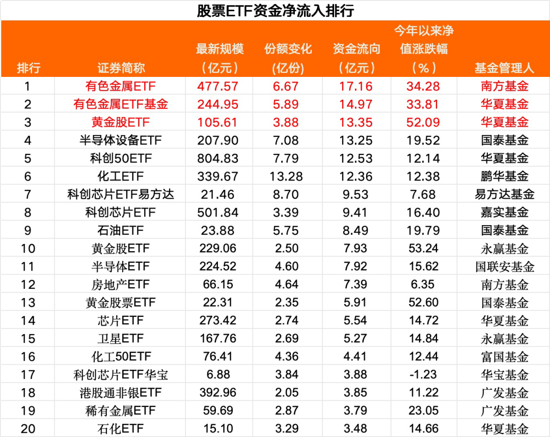 华夏基金ETF方面,上一交易日,有色金属ETF基金和黄金股ETF单日净流入居前,分别净流入14.97亿元和13.35亿元;最新规模分别达244.95亿元和105.61亿元,对应跟踪指数近一月日均成交额分别为6.36亿元和4.51亿元。科创50ETF和芯片ETF分别净流入12.36亿元和5.44亿元,黄金ETF华夏、石化ETF、科创半导体ETF净流入都超3亿元,航空航天ETF净流入1.3亿元。