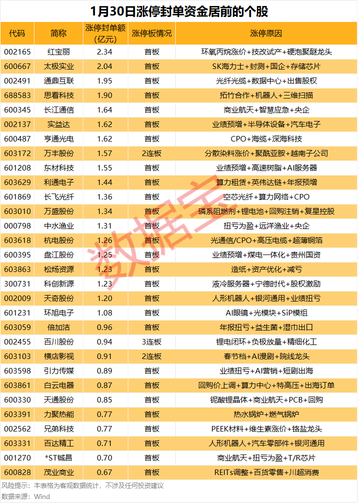 从连续涨停天数看,湖南黄金已连收5个涨停板,连续涨停板数量最多。以封单金额计算,红宝丽、太极实业、通鼎互联等涨停板封单资金居前,分别有2.34亿元、2.04亿元、1.95亿元。