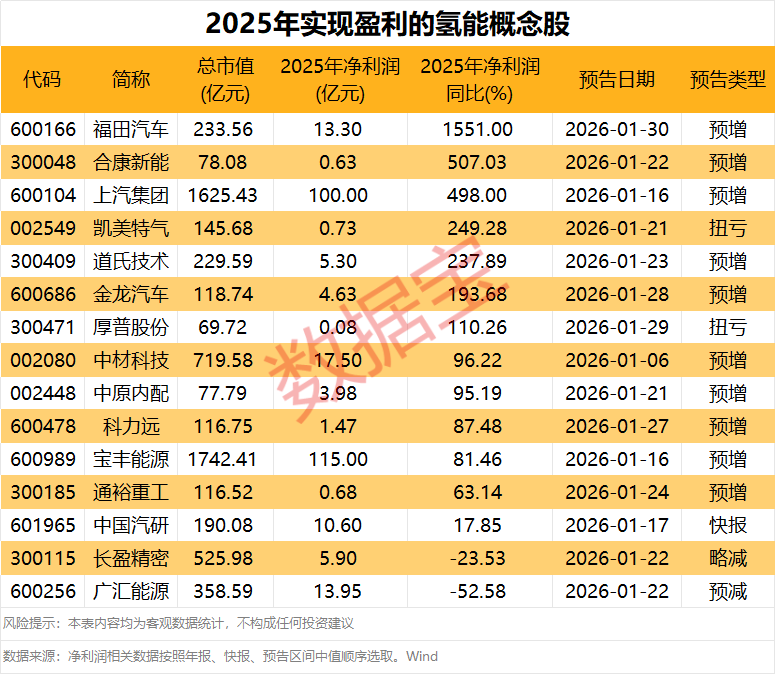 截至1月30日,已有27只氢能概念股发布2025年业绩相关报告,其中15股预计实现盈利。以业绩快报数据或预告中值统计,宝丰能源和上汽集团全年净利润规模预计不低于100亿元;中材科技、广汇能源、福田汽车、中国汽研4股净利润规模在10亿元以上。