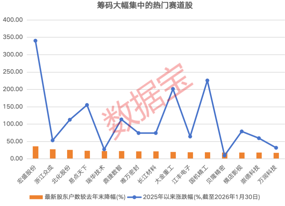 据证券时报·数据宝统计,以国防军工、基础化工、电力设备等为主的热门主线股中,截至2026年1月30日,最新股东户数较去年末(2025年12月31日)下降幅度不低于5%的个股有116只。