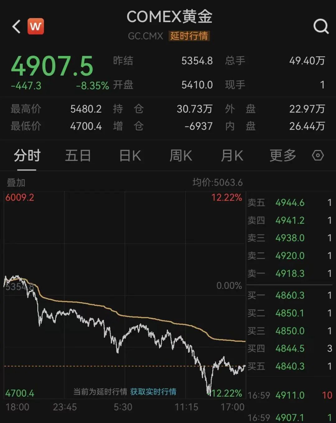 COMEX黄金期货跌8.35%报4907.50美元/盎司,本周累计下跌1.45%。现货黄金收跌9.25%,报4880.034美元/盎司,盘中一度跌近13%,跌破4700美元/盎司。