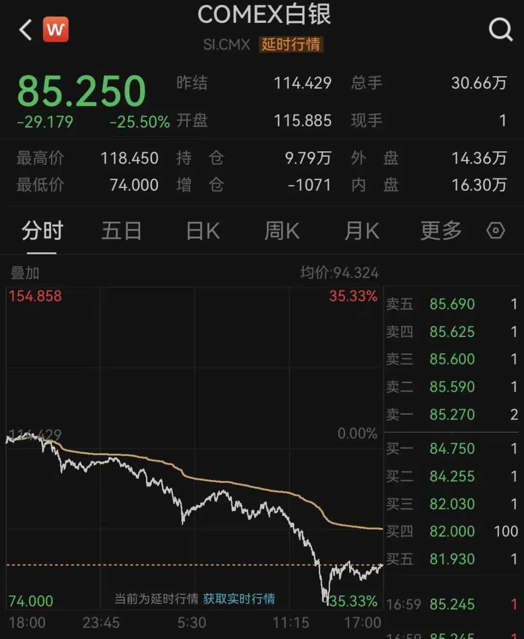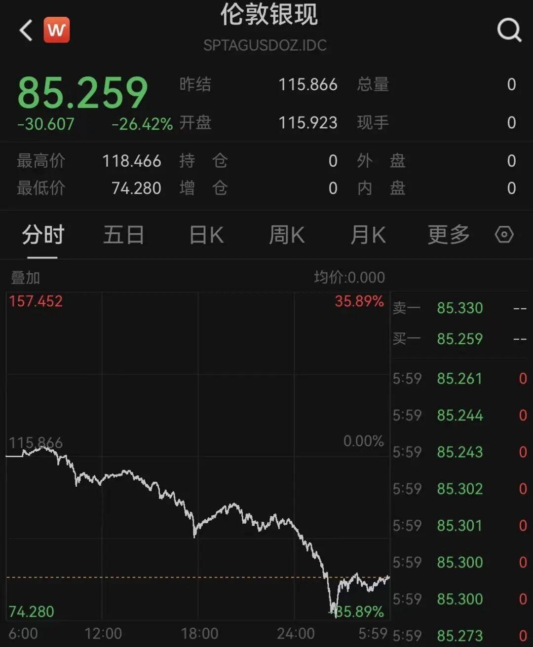 COMEX白银期货跌25.50%报85.25美元/盎司,本周累计下跌15.87%。白银现货收跌26.42%,报85.259美元/盎司,盘中一度跌超35%,跌破75美元/盎司。