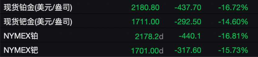 除了黄金白银外,现货铂金、现货钯金、NYMEX铂、NYMEX钯亦大幅下挫,跌幅均超过10%。