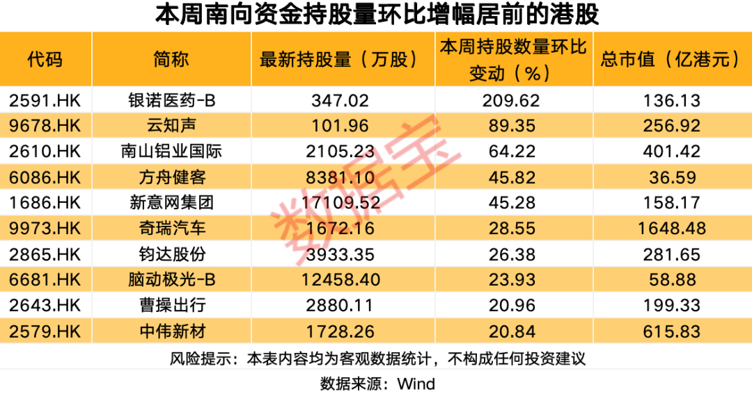 从持股量变化来看,本周10股获得南向资金持股量环比增长超20%,银诺医药-B居首,环比增长209.62%,其他还有云知声、南山铝业国际、方舟健客持股量环比增幅居前,持股量环比增幅分别为89.35%、64.22%、45.82%。