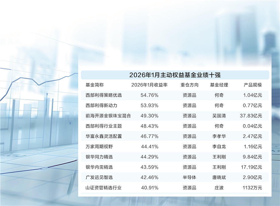 2026年开年首月,A股市场结构性行情特征凸显,权益类基金赚钱效应释放,业绩喜迎开门红,其中,资源主题基金强势霸屏业绩榜单,在首月收益十强基金中,9只基金均重仓配置资源赛道,周期已成基金经理开年选股的最大偏好。去年风靡市场的科技行业基金,仅占据一个席位,公募业绩榜单的行业主题特征已上演一轮快速切换。