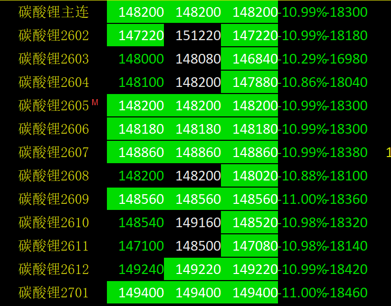 1月30日,锂矿概念集体调整,锂矿板块跌超6%,金圆股份、威领股份、西部矿业、西藏矿业等跌超9%。当日,碳酸锂期货也呈现持续下行态势,多个合约跌停,主力合约LC2605下跌10.99%,报收148200元/吨。
