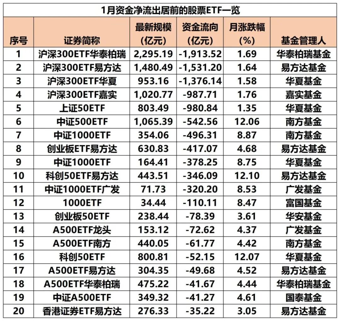 从单月资金净流出排行看,沪深300ETF、上证50ETF、中证500ETF、中证1000ETF等宽基ETF成为“失血”大户。