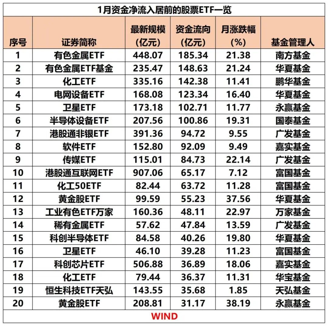 拉长时间来看,1月股票ETF资金累计净流出超7900亿元,有色金属ETF、化工ETF、电网设备ETF、卫星ETF等热门主题ETF资金净流入居前,沪深300ETF、上证50ETF、中证500ETF、中证1000ETF等宽基ETF成为“失血”大户。