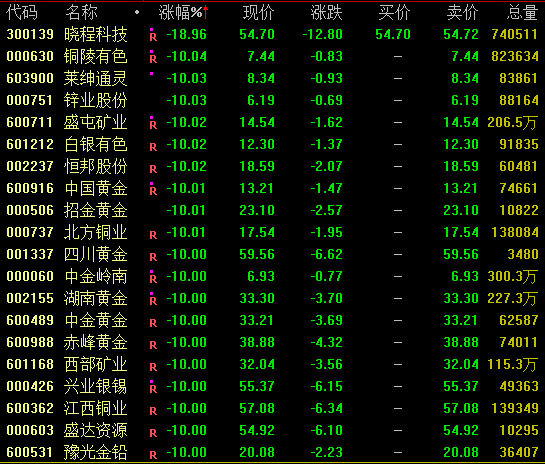 今日,A股市场石油、煤炭、有色、钢铁等资源股集体跳水,其中黄金概念股掀跌停潮,板块内近30股跌停。