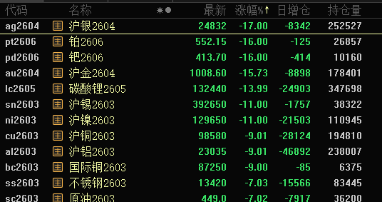 商品期货方面,伦敦金现货下跌超4%,伦敦银现货下跌超7%,沪金、沪银分别下跌15.73%、17%,沪锡、沪铜、沪铝、碳酸锂等跌停。