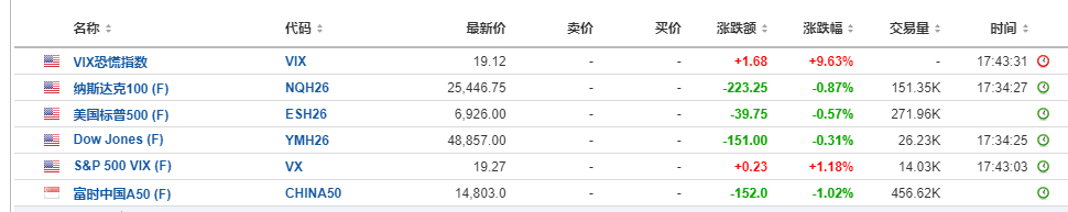 同时,美股股指期货亦有明显跌幅,纳斯达克100期货最高下跌1.91%,截至发稿,仍下跌逾0.8%,标普500期货、道琼斯期货目前均为下跌,恐慌指数大涨近10%,市场恐慌情绪蔓延。