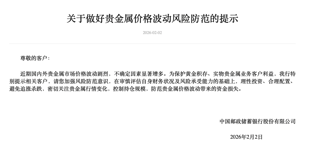 同样在2月2日, 中国邮政储蓄银行也在官网发布提示信息显示, 近期国内外贵金属市场价格波动剧烈,不确定因素显著增多。为保护黄金积存、实物贵金属业务客户利益,该行特别提示相关客户,加强风险防范意识,在审慎评估自身财务状况及风险承受能力的基础上,理性投资、合理配置、避免追涨杀跌,密切关注贵金属行情变化,控制持仓规模,防范贵金属价格波动带来的资金损失。