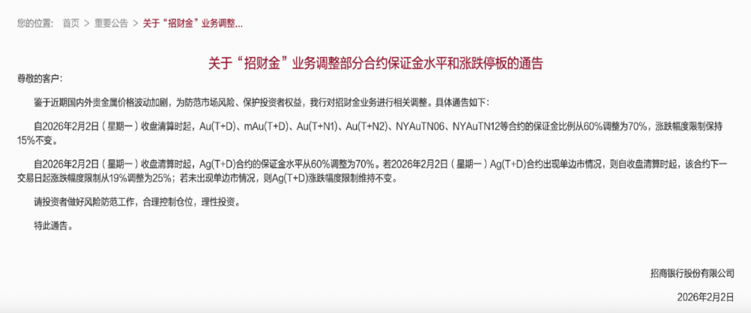 2月2日,招商银行发布公告称,鉴于近期国内外贵金属价格波动加剧,为防范市场风险、保护投资者权益,该行对招财金业务进行相关调整。具体来看: