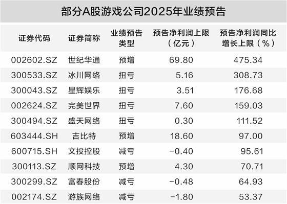 在此背景下,A股多家游戏公司预计2025年业绩将实现显著增长。根据Wind数据,截至2026年2月2日,A股26家游戏公司中的17家已披露2025年度业绩预告或快报,世纪华通、顺网科技、吉比特等预计业绩将大幅增长;与此同时,有部分游戏企业预计2025年度将出现亏损。