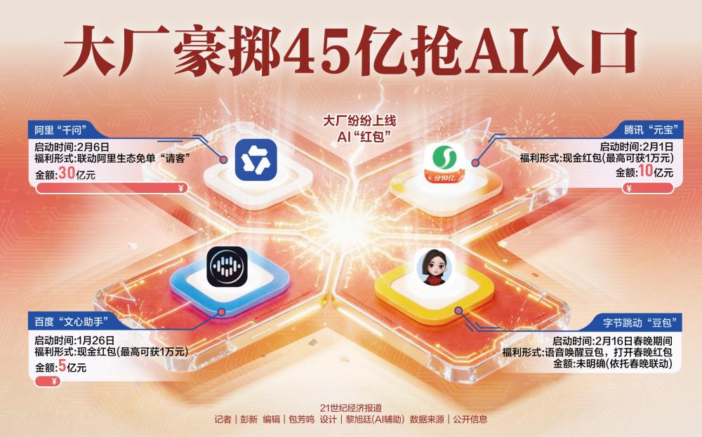 1月25日,百度宣布旗下AI应用文心助手1月26日上线春节红包活动,用户参与活动就可以分5亿元现金红包,最高可获得1万元奖励。百度App还和2026年北京电视台春晚合作,结合春晚场景推出多种不同AI应用玩法。