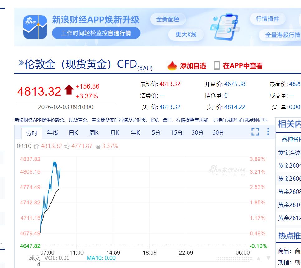 2月3日亚市早盘,黄金白银强劲反攻。截至发稿,现货黄金突破4813美元/盎司,日内一度涨超3%;