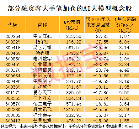 资金层面上,多只超跌的AI大模型概念股获得融资客加仓。数据宝统计,截至2月2日收盘,1月以来融资净买入超1亿元的AI大模型概念股有22只。以2月2日收盘价与年内高点相比,7股回撤幅度超20%,分别为中文在线、拓尔思、昆仑万维、汤姆猫、电科数字、创业慧康、汉得信息。