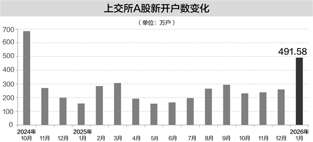 上交所发布的新开户数据显示,2026年1月上交所A股新开户491.58万户,环比增长约89%,同比增长约213%,创下2024年11月以来近15个月新高。