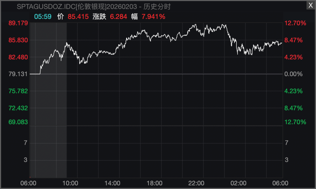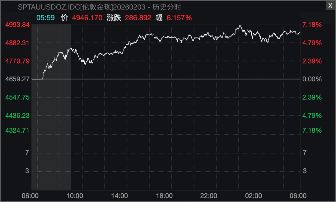 金银齐涨。截至收盘,国际现货黄金收涨超6%,报4946.17美元/盎司;现货白银涨近8%,报85.415美元/盎司。