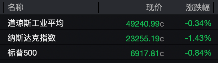 热门科技股多数下跌。美光科技跌超4%,甲骨文跌超3%,微软、英伟达跌近3%,Meta跌超2%;英特尔、特斯拉小幅上涨,闪迪涨超4%,西部数据涨超7%。