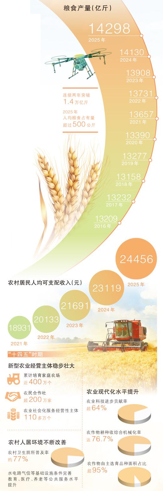 2025年,我国粮食生产克服多重不利天气影响,产量再创历史新高,连续两年稳定在1.4万亿斤以上。