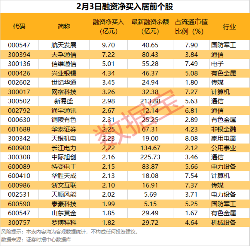 统计显示,具体到个股,2月3日共有1625股获融资净买入,净买入金额在千万元以上的有425股,其中39股融资净买入额均超1亿元。