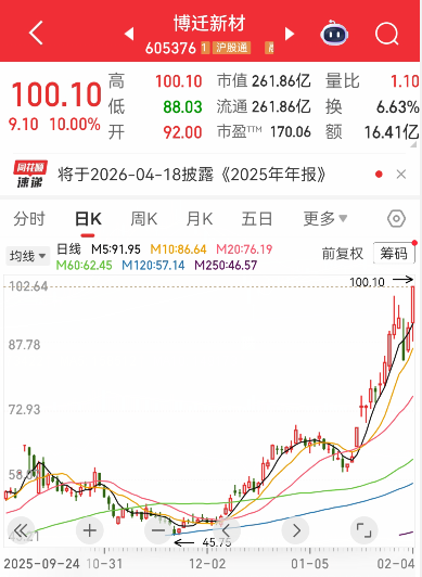 人民财讯2月4日电,2月4日,博迁新材(605376)收盘涨停,最新股价100.1元/股,首次突破百元大关。公司预计2025年净利润为2亿元至2.4亿元,同比增长128.63%到174.36%。