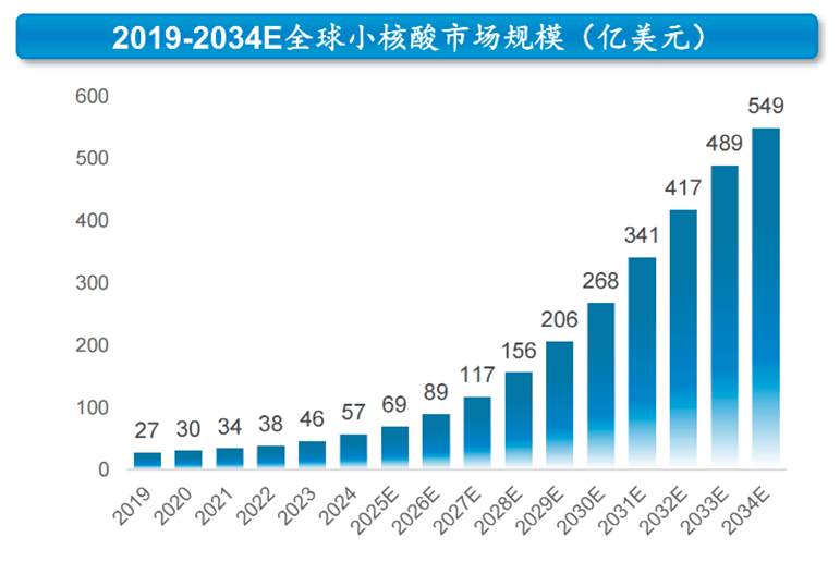 数据显示,全球小核酸药物市场规模已从2019年的27亿美元增长到2024年的57亿美元,复合年增长率为16.2%。根据沙利文预测,2029年及2034年将分别达到206亿美元及549亿美元,2024年至2029年的复合年增长率为29.4%,2029年至2034年的复合年增长率为21.6%。