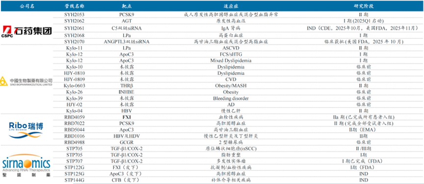 当前有石药集团、瑞博生物、圣诺医药、舶望制药、大睿生物、靖因生物、圣因生物等研发平台型企业,其中石药推进成熟靶点的中美临床,力争双链siRNA疗效优势;瑞博既有肝外递送技术,又布局PCSK9等热门靶点;圣诺既有双靶点技术,又深耕肿瘤适应症;而中生制药通过收购赫吉亚快速切入小核酸赛道,主打LPa超长效年制剂,目前已进入2期临床阶段。