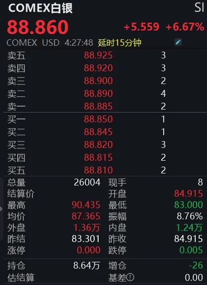 期货市场同步拉升。截至发稿,COMEX黄金期货日内大涨3.01%,交投于5080美元/盎司附近,盘中最高触及5113.9美元/盎司;COMEX白银期货上涨6.67%,报88.86美元/盎司,最高也突破90美元/盎司大关。