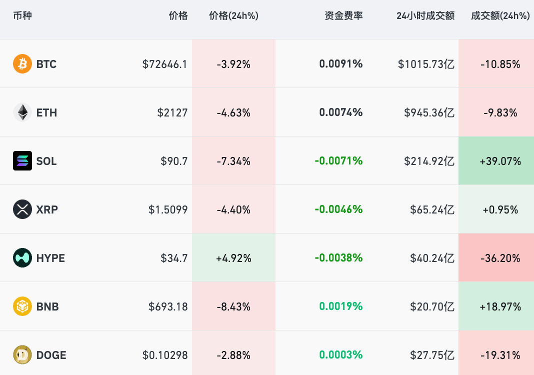 比特币引领的抛售潮加速,加密货币主要币种持续下挫,截至北京时间7:10,比特币跌近4%报72646美元/枚,SOL重挫逾7%,ETH、XPR跌超4%。最近24小时,全球共有超14万人被爆仓。