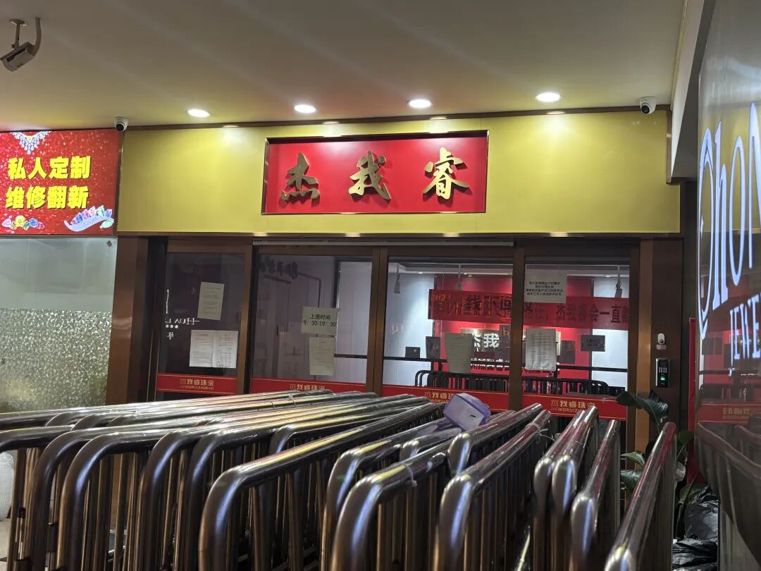 大门前贴着1月24日公布的清偿流程、现场登记提示,门后则悬挂着“感谢粉丝的支持与信任杰我睿”“线下回收”等数条醒目红色横幅,但楼道口已被封禁,大门也已紧锁,无法从外部靠近。1月30日上午,深圳市杰我睿珠宝有限公司(下称“杰我睿”)位于深圳市特发保税大厦3栋3楼A区的办公点,已经人去楼空。